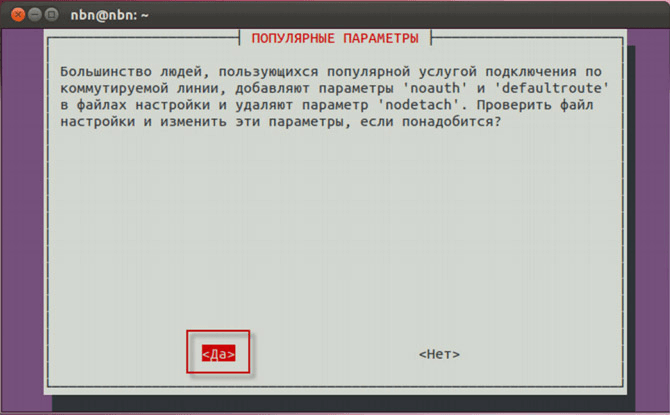 4. Далее у вас спросят, хотите ли вы использовать опции defaultroute (автоматически добавляет маршрут по умолчанию ) и noauth (не требовать от аутентификации PPPoE сервера) и удалить опцию nodetach.