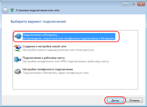 5. Оставить выделение на первом пункте «Подключение к интернету», нажать «Далее».