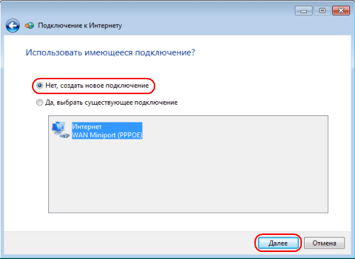 6. Если на компьютере ранее уже было создано PPPoE подключение, то выскочит данное окно. Поставить точку на «Нет, создать новое подключение», нажать «Далее».