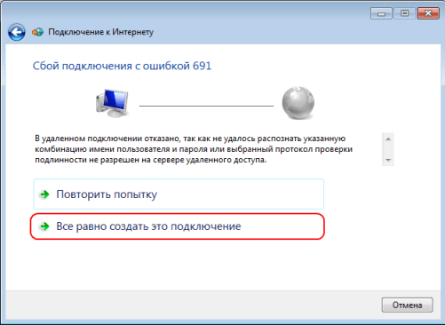 9. Результатом подключения должно быть «Сбой подключения с ошибкой 691». Нажимайте «Всё равно создать это подключение».