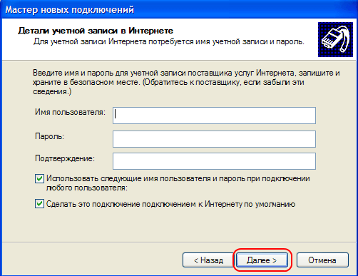 6. На данном этапе логин и пароль вводить не стоит, нажимаем «Далее»