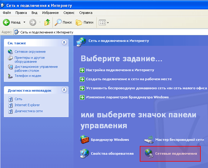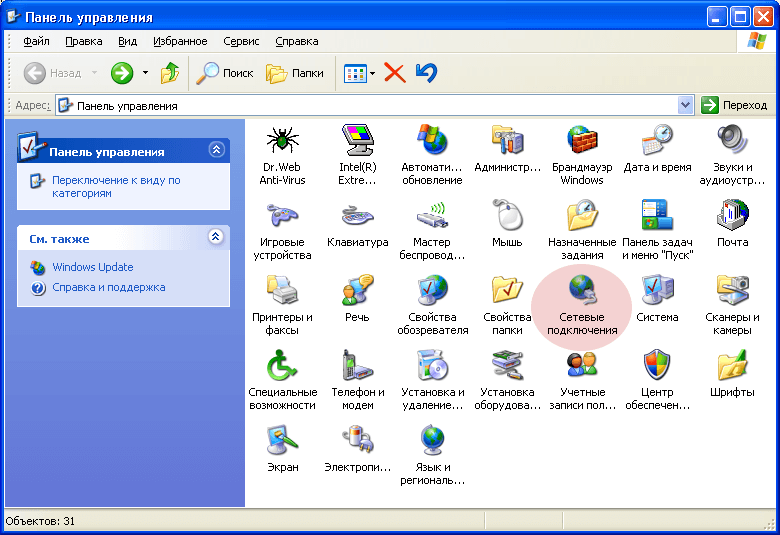2. Если ярлыков в панели управления ~10, то «Сеть и подключения к интернету» → «Сетевые подключения»