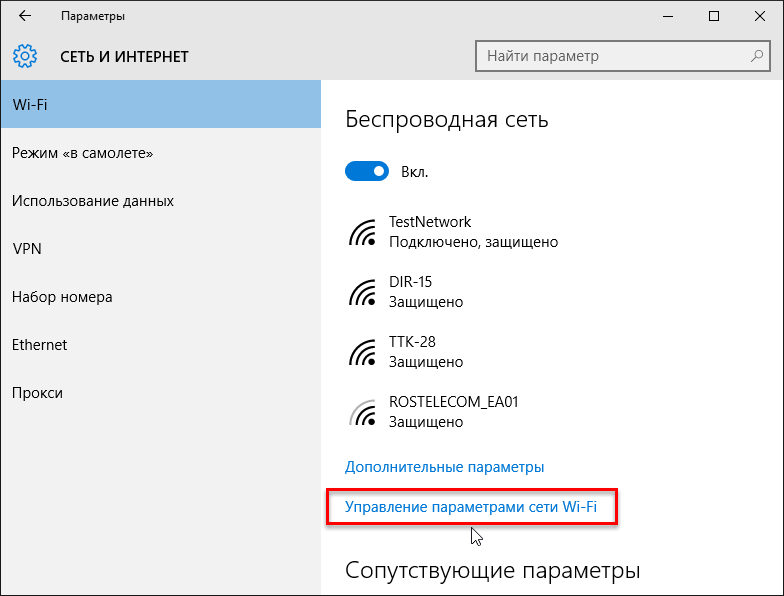 В следующем окне в разделе Wi-Fi нажмите на ссылку «Управление параметрами сети Wi-Fi»