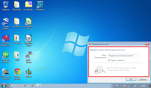 3. В появившемся окне вводим «Ключ безопасности» сети и нажимаем «Ок»