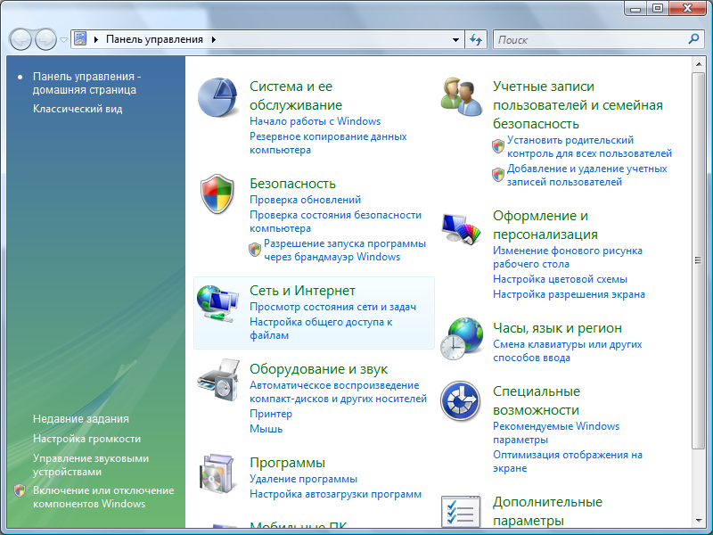2. В «Панели управления» в разделе «Сеть и интернет» выберите пункт «Просмотр состояния сети и задач»