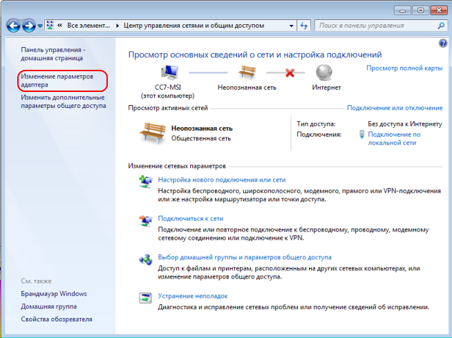 1. На ПК зайдите в сетевые подключения или изменения параметров адаптера