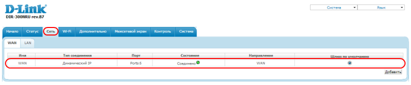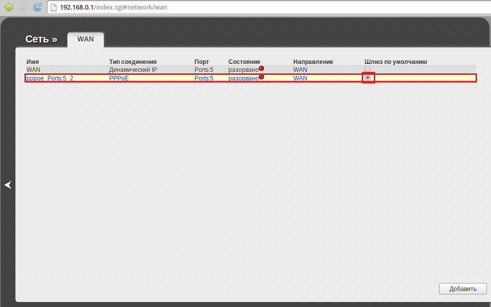 И так, теперь нажимает на вкладку «Сеть», далее открывается меню-таблица с настройками подключений. Нам нужна первоначально строка с именем WAN — выбираем её.
