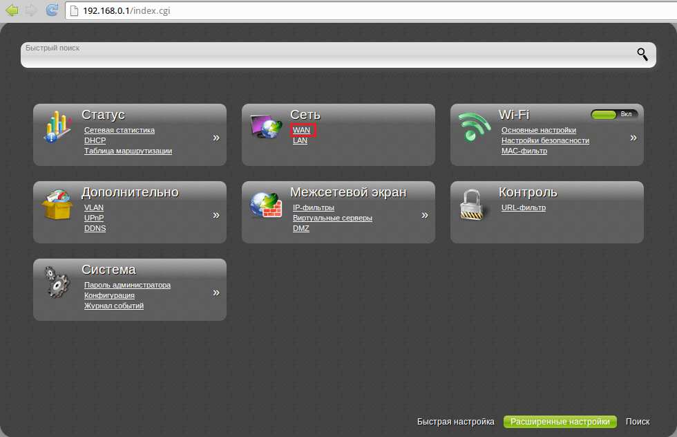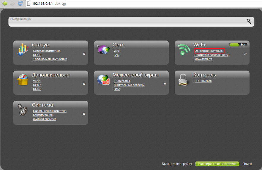 Возвращаемся на стартовую страницу выбора настроек в расширенном варианте и щелкаем «Основные настройки под Wi-Fi»