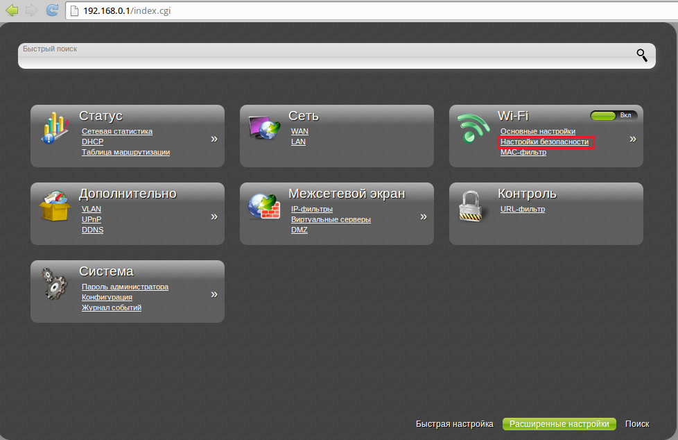 Снова возвращаемся на стартовую страницу выбора настроек в расширенном варианте и щелкаем Настройки безопасности под Wi-Fi