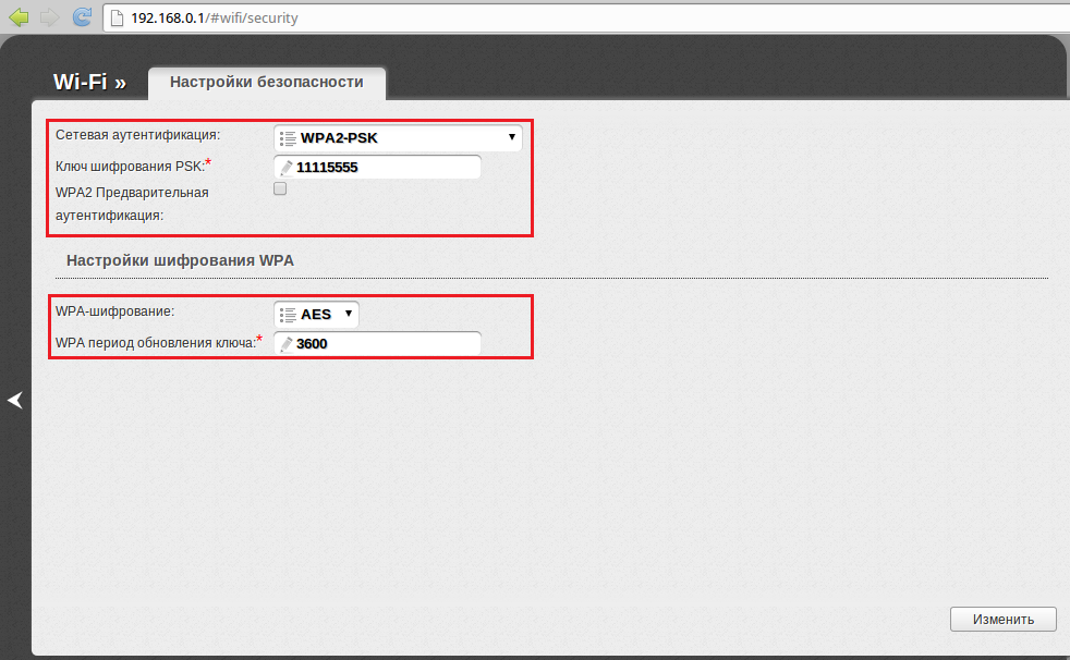 Открываем вкладку «Настройки безопасности», и изменяем сетевую аутентификацию с OPEN на WPA-PSK/WPA2-PSK mixed, в строке ключ шифрование вводим ключ безопасности сети (пароль от Wi-Fi сети) не менее 8-ми символов. Нажимаем Изменить и Сохранить в появившемся сверху окошке (если вы настраивали роутер по Wi-Fi сети, подключение вновь разорвется, нужно будет ввести тот 8-ми значный номер для подключения к Wi-Fi сети, который вы только, что вводили в поле «ключ шифрования»).