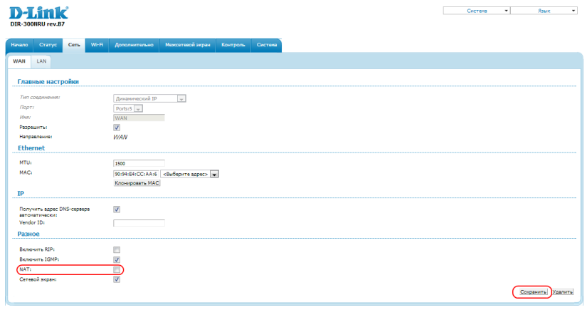 В нижней части окна снимаем галочку с пункта NAT (это необходимо для работы IPTV), больше ничего менять не нужно, затем выбираем «сохранить».