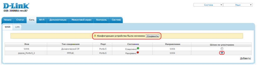 Появляется уведомление, снова нажимаем «Сохранить». Затем обязательно нажимаем на точку (даже если она уже стоит) «Шлюз по умолчанию» в строке pppoe, опять сохраняем. На этом настройка интернета завершена, можно попробовать открыть сайт, но Wi-Fi-сеть нам ещё предстоит настроить.
