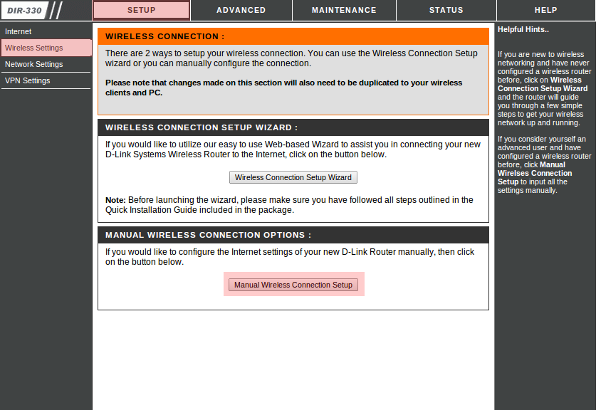 Для этого заходим: Setup → Wireless settings → Manual Wireless connection setup.