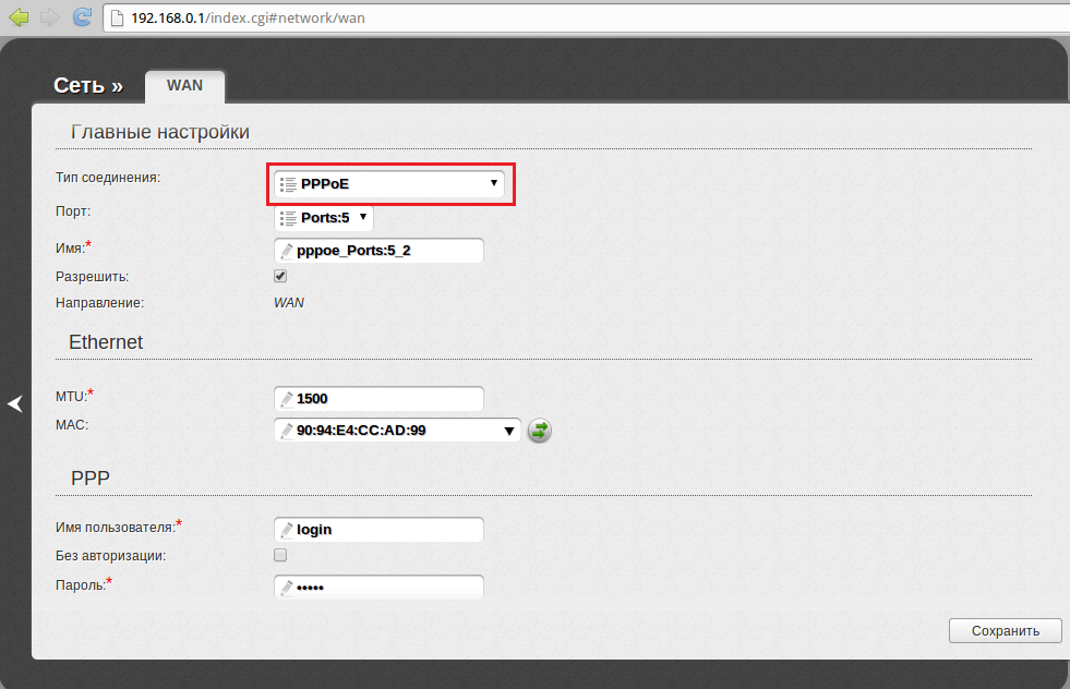 Следующий этап, один из главных в котором мы настраиваем само соединение с интернетом, страница разбита на несколько групп элементов: Главные настройки, Ethernet и PPP. В главных настройках нам нужно выбрать «тип соединения» выбираем PPPoE. В Еthernet ничего трогать не нужно. Осталось только PPP, где мы должны ввести свои данные (логин и пароль от интернета), галочку «без авторизации» ставить не нужно. В поле MTU вписываем 1450. Если вы всё сделали правильно то в нижней части окна нажимаем Сохранить.
