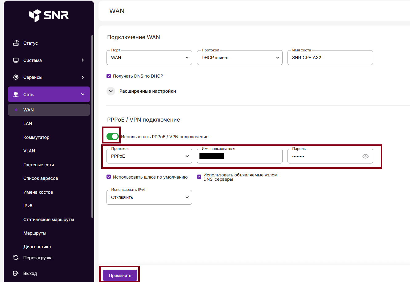 Заполните поля «Имя пользователя» и «Пароль» (их выдают при подключении). Нажимаем «Применить»
