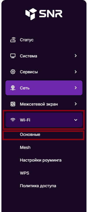 3. Для настройки сети Wi-Fi в левом меню нажмите «Wi-Fi» → «Основные»