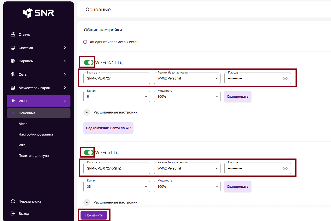4. Придумайте названия для сети Wi-Fi и пароль (ключ безопасности). Жмите «Применить»