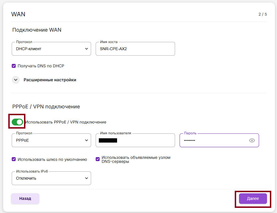Заполните поля «Имя пользователя» и «Пароль» (их выдают при подключении). Нажимаем «Далее»