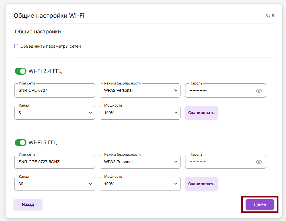6. В настройках Wi-Fi придумываем названия для сетей и пароли. Их можно сделать одинаковыми. Нажимаем «Далее»