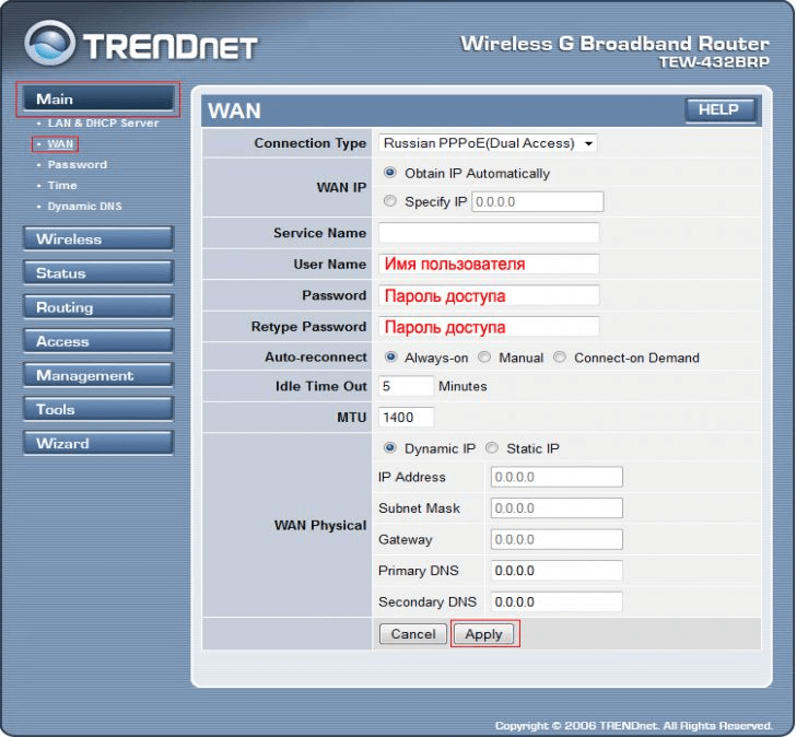 MTU – 1492, WAN Physical – выбираем Dinamic IP