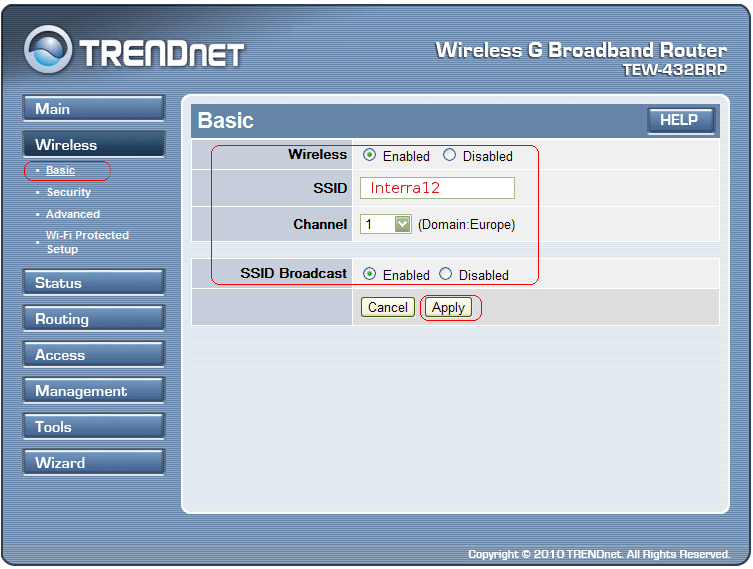 В открывшемся окне в поле SSID укажите имя вашей беспроводной сети, в соответствием с номером квартиры, например, interra12. Нажмите кнопку Apply.
