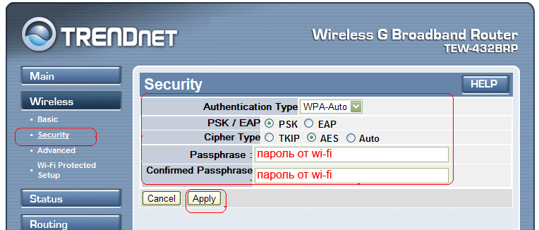 Настройка безопасности Wi-Fi сети производится в пункте Wireless → Security. В открывшемся окне выбираем: