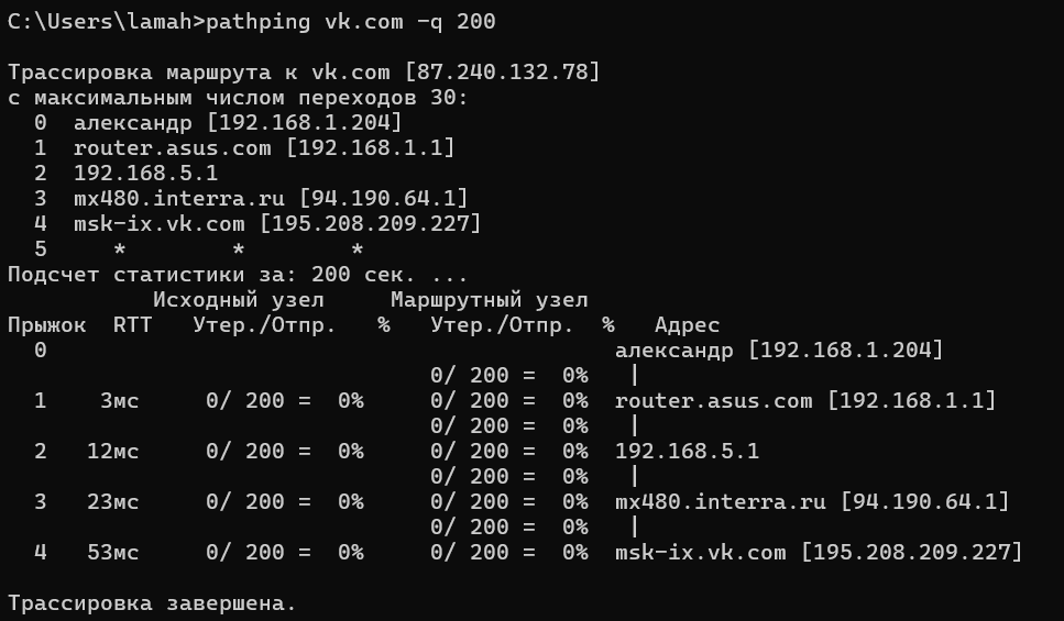 Например «pathping vk.com -q 200» то в ответ мы увидим ту же трассировку, но с указанием пинга на каждом узле.