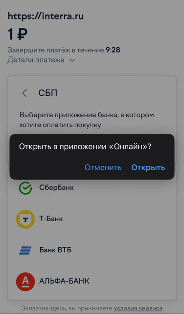 3. Далее нужно подтвердить открытие мобильного приложения вашего банка. В приложении банка укажите счет списания (при необходимости) и подтвердите операцию.